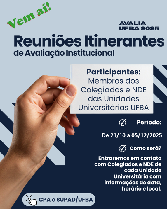 No final do mês de outubro, a CPA e Supad da UFBA iniciarão a realização das Reuniões Itinerantes de Avaliação Institucional 2025. Essas reuniões serão realizadas com os membros dos Colegiados e Núcleos Docente Estruturantes dos cursos de Graduação da universidade com o objetivo de fomentar o diálogo com as pessoas das Unidades Universitárias acerca dos desafios da Avaliação Institucional da UFBA. Também terão como foco dialogar sobre as coletas de dados regulares já existentes de Avaliação Institucional na UFBA; propor estratégias para a realização da autoavaliação nos cursos de Graduação; fomentar a apropriação e o uso das informações avaliativas geradas; estimular a ampla participação e divulgação das ações avaliativas e seus resultados.